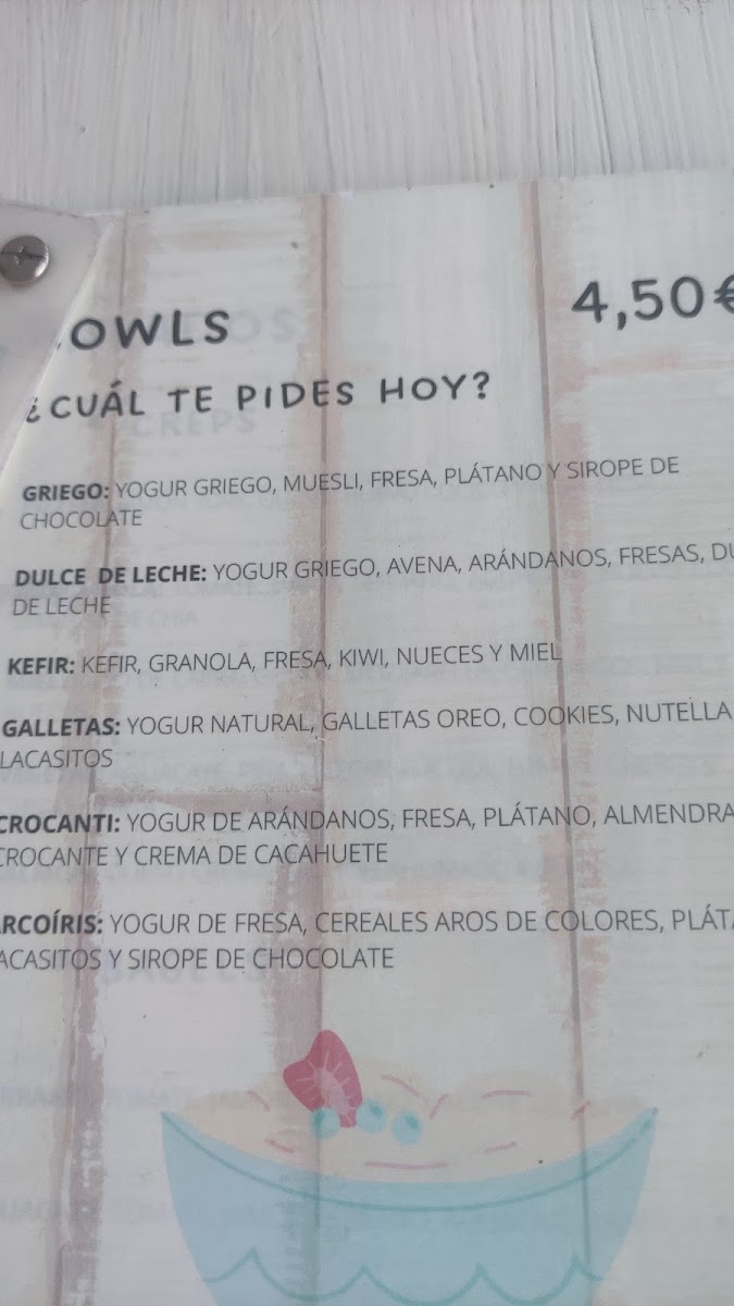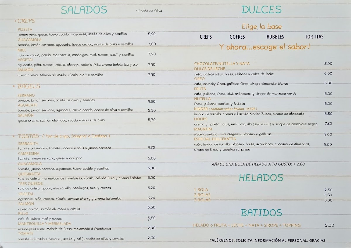 - Sweet Treats and Desserts: Options include waffles in different styles such as Gofre de Dulce de Leche, Gofre Crocanti de Nutella, and Bubble Oreo, as well as tortitas (pancakes) topped with fruit or syrups.